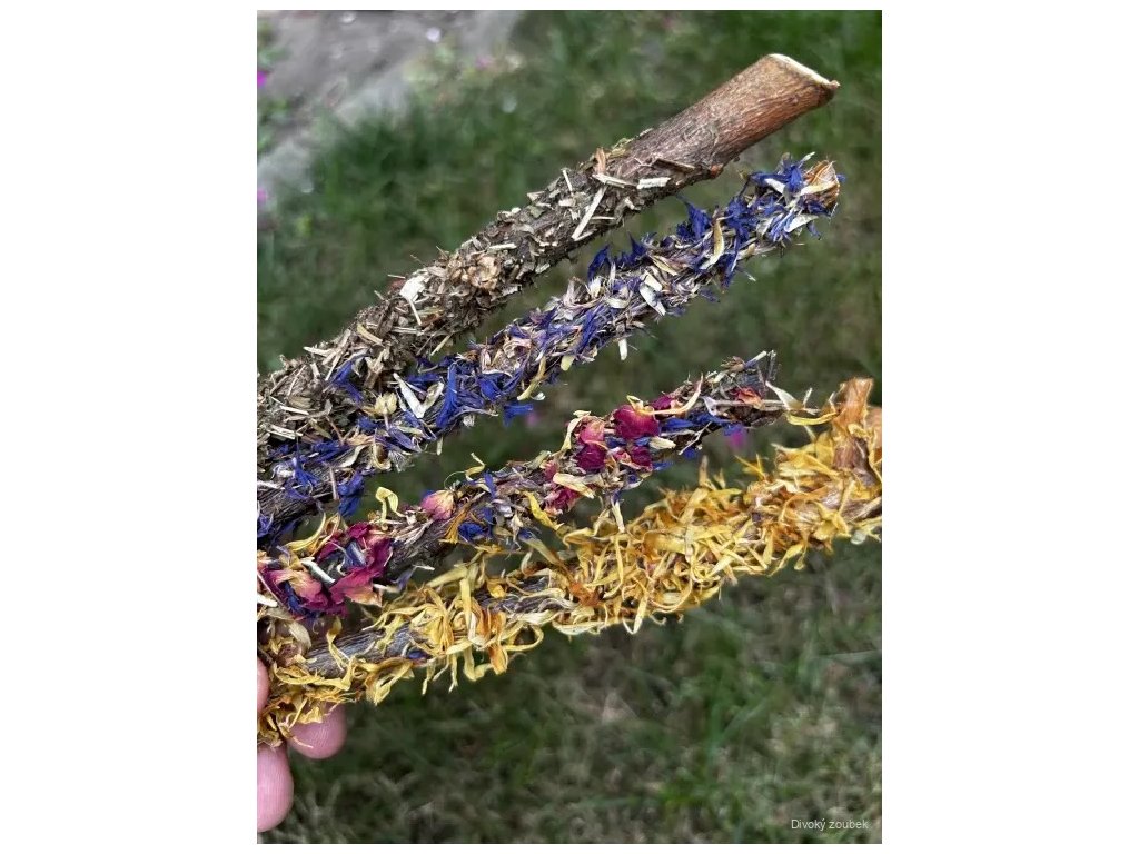 Dopřejte svému králíčkovi jedinečný zážitek! Naše květinové hůlky spojují zdravé větvičky s voňavými bylinkami a květy, které nejen skvěle chutnají, ale také pomáhají obrušovat zoubky – což je pro zdraví králíčků naprosto nezbytné.
