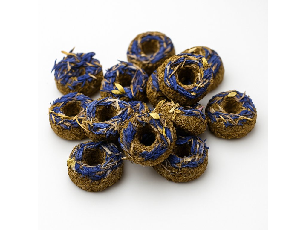 Díky pevnému tvaru donut podporuje přirozené obrušování zubů a zároveň slouží jako chutné zpestření běžné krmné dávky. Chrpa je oblíbená pro svou jemnou chuť a vizuálně atraktivní modrou barvu, která vzniká čistě přírodní cestou.