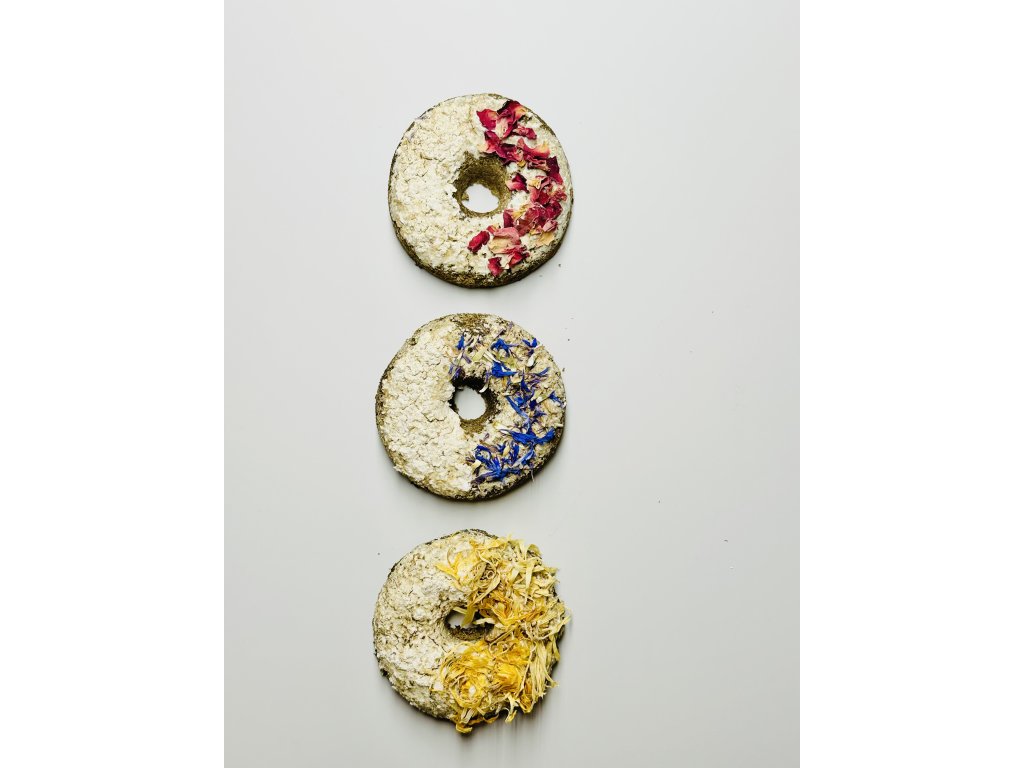 Our hay donuts are designed to please the eyes and taste buds of every sweet-toothed cat. Each donut is hand-pressed from high-quality hay and decorated with rose, cornflower or marigold petals, which provide not only a beautiful aroma, but also beneficial effects: