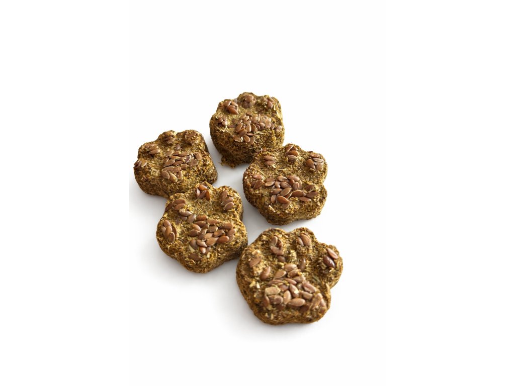 Ručně tvarované pacičky ze sena obalené v kvalitním lněném semínku.