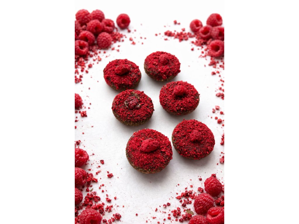 Jemný senný pamlsek, doplněný malinovým posypem a kousky sušené maliny🍓.
