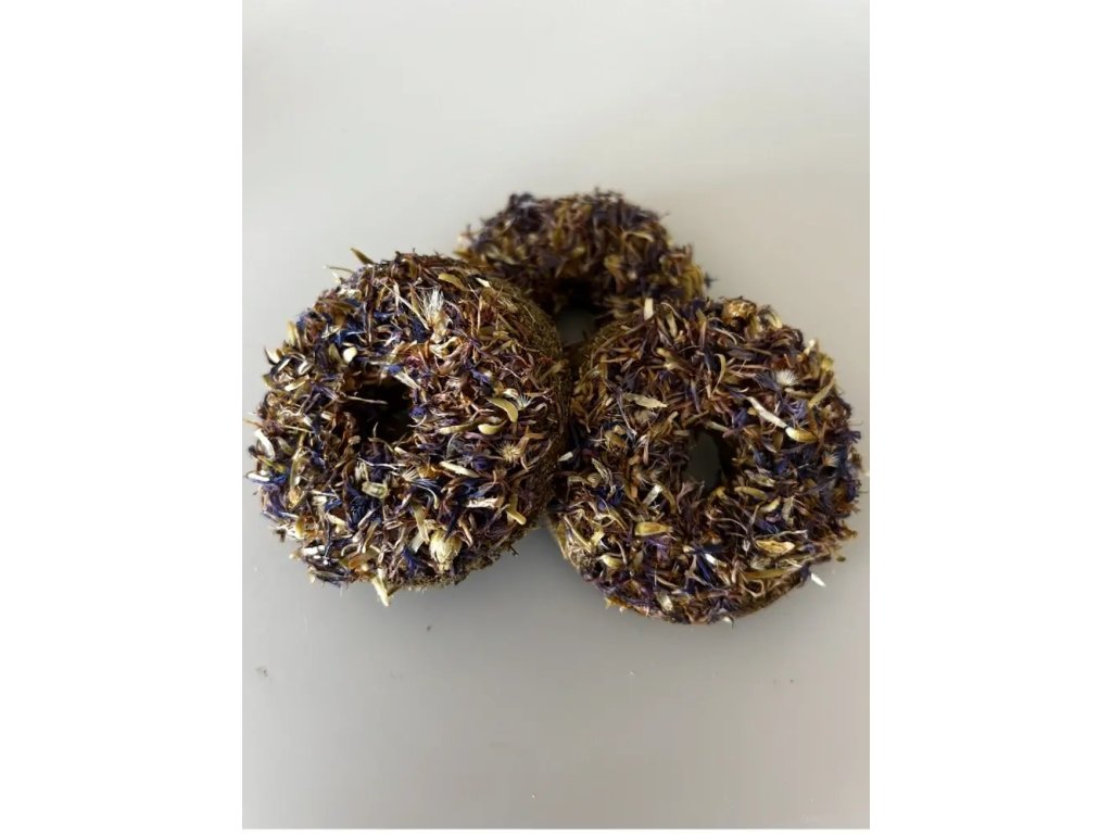 Donut s modrou chrpou je jemný přírodní pamlsek pro králíky a další malé hlodavce, kteří si zaslouží poctivé dobroty bez chemie. Modrá chrpa podporuje trávení, pomáhá zklidnit zažívání a dodává pamlsku nezaměnitelnou vůni i vzhled.