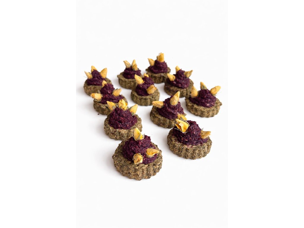 Ručně vyráběné senné pamlsky z kvalitního sena, doplněné jemným krémem z červené řepy a zdobené sušeným žlutým poupětem. Nejen že krásně vypadají, ale jsou i funkční – podporují správné obrušování zoubků a zpestří každodenní mlsání.