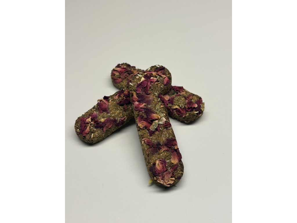 Naše Růžová senná tyčinka vzniká ruční výrobou z kvalitního lučního sena, které je jemně tvarováno a zdobeno sušenými okvětními lístky růže. Tyčinka je lehká, voňavá a ideální jako zdravé zpestření jídelníčku.