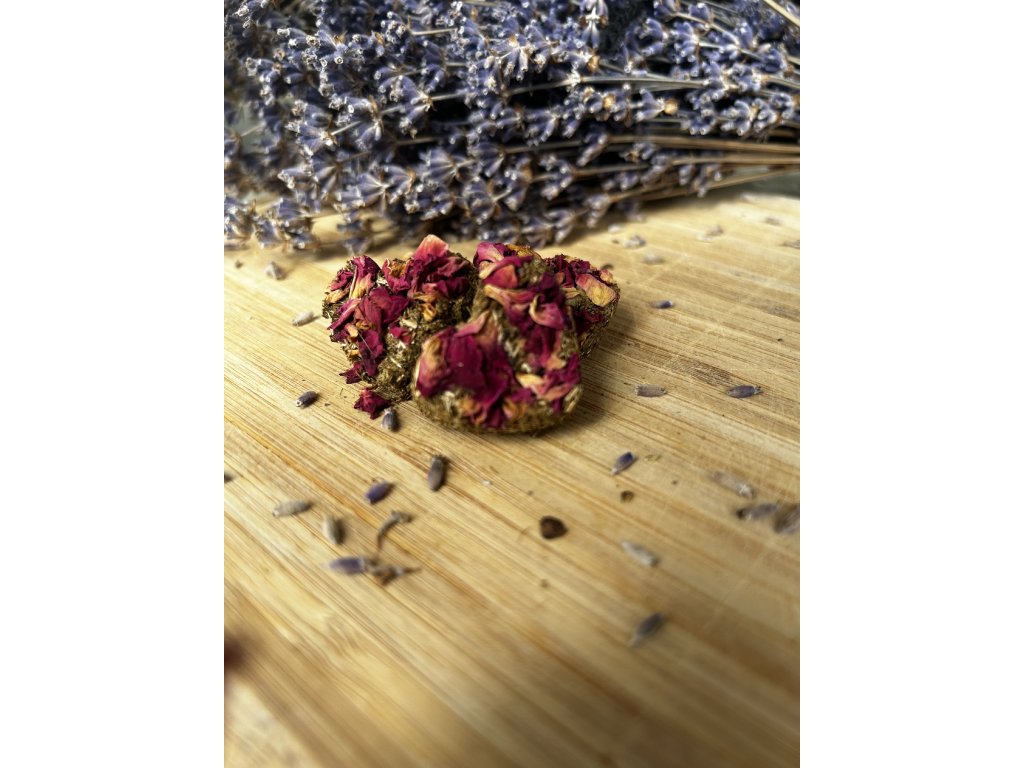 Voňavá kombinácia lúčneho sena a jemných okvetných lístkov ruže poteší maškrtné jazýčky Vašich ušiakov aj morčiatok. 🌹