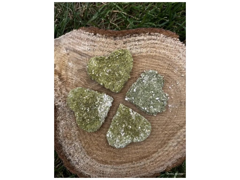 Každý kousek je ručně vyráběný bez barviv, dochucovadel, obilných směsí a chemie. Díky svému tvaru srdíček přidávají pamlsky do krmného rituálu radost, lásku a zpestření.