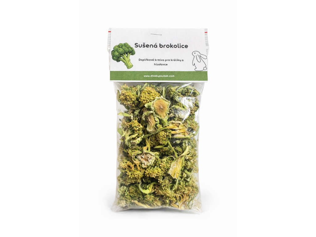 Sušená brokolice je lahodné a zdravé zpestření jídelníčku pro králíky a malé hlodavce. Obsahuje vlákninu podporující správné trávení a díky šetrnému sušení si zachovává svou přirozenou chuť i živiny.