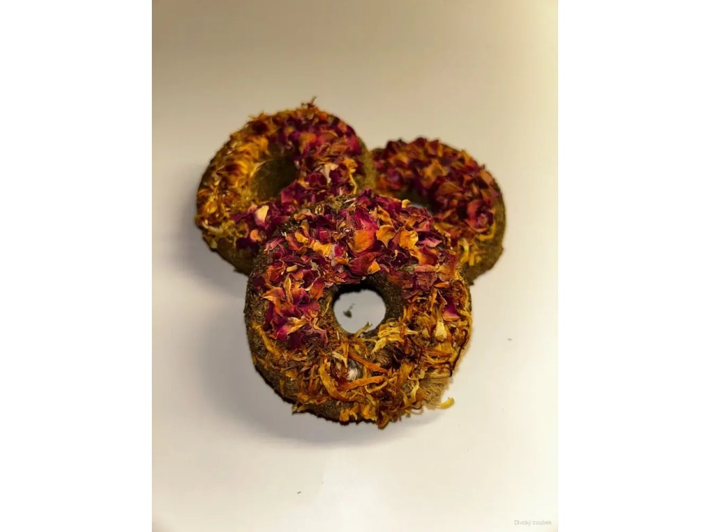 Donut s růží a měsíčkem je lahodný a voňavý pamlsek vyrobený z kvalitního sena, lněného semínka a směsi květů růže a měsíčku.